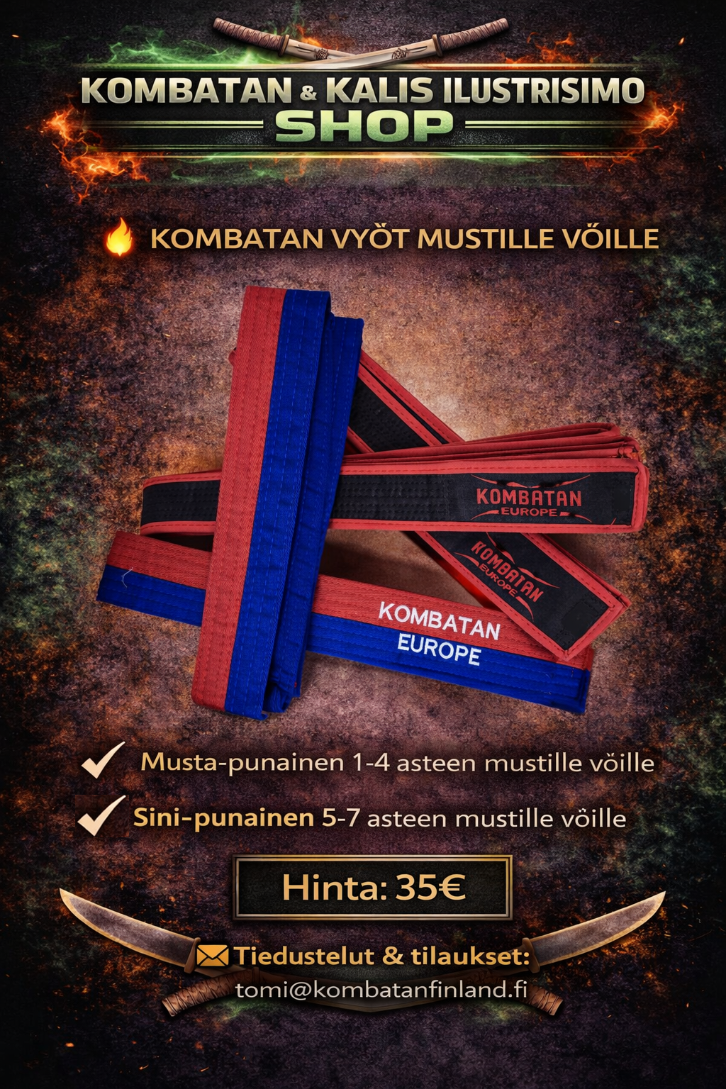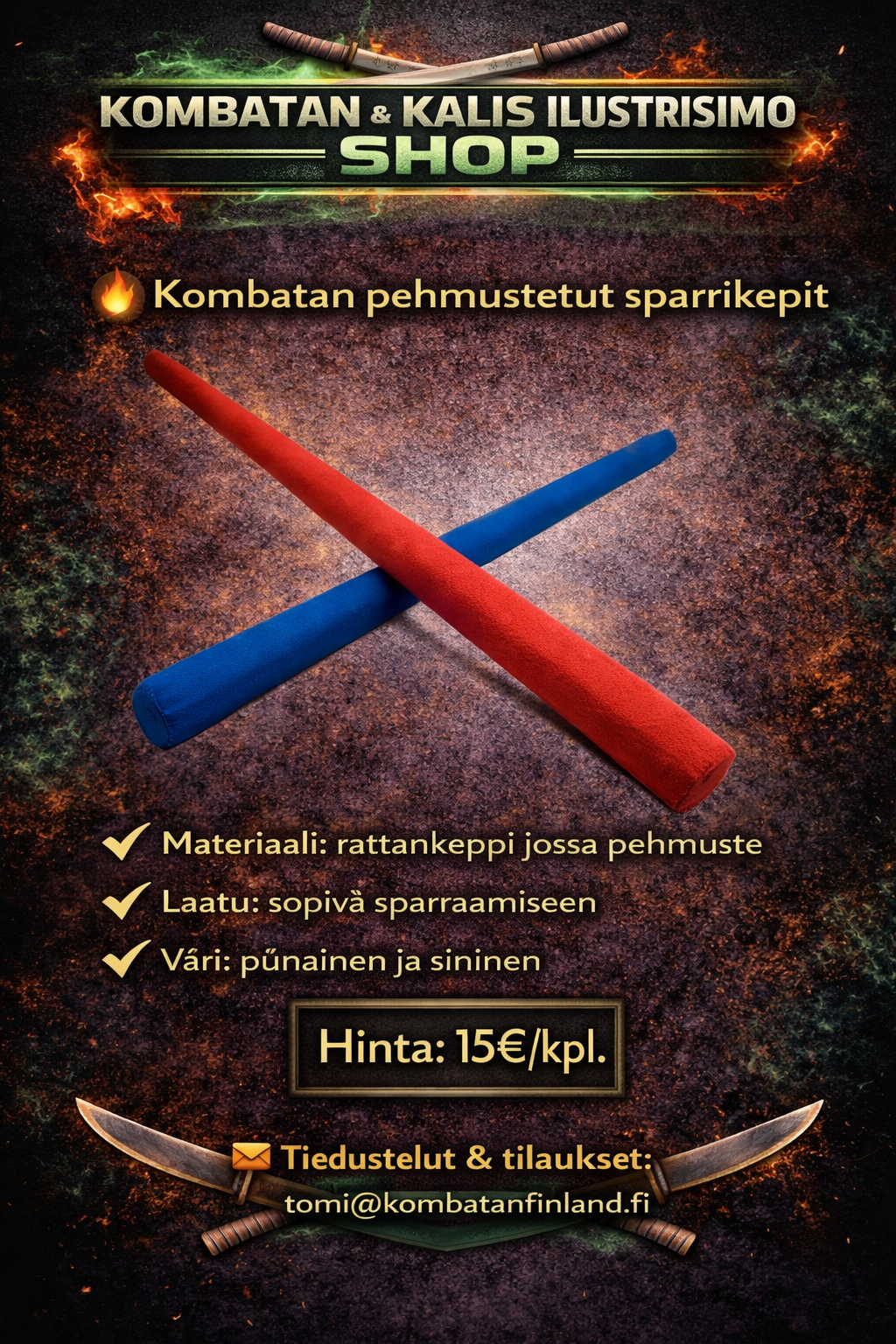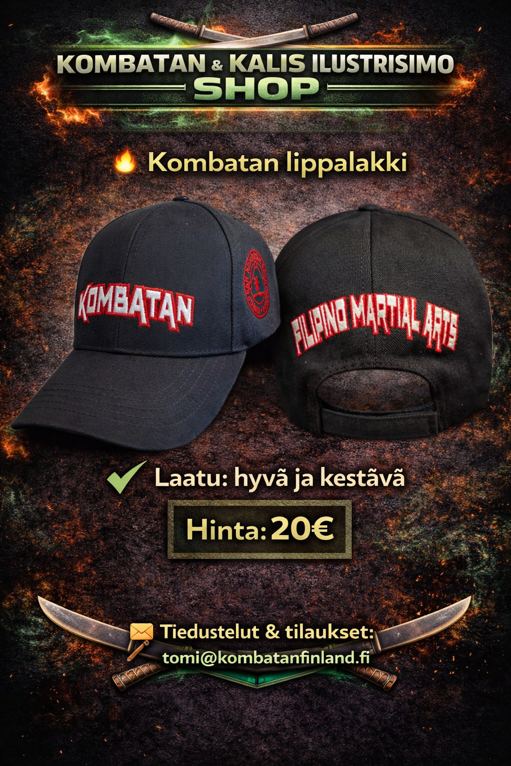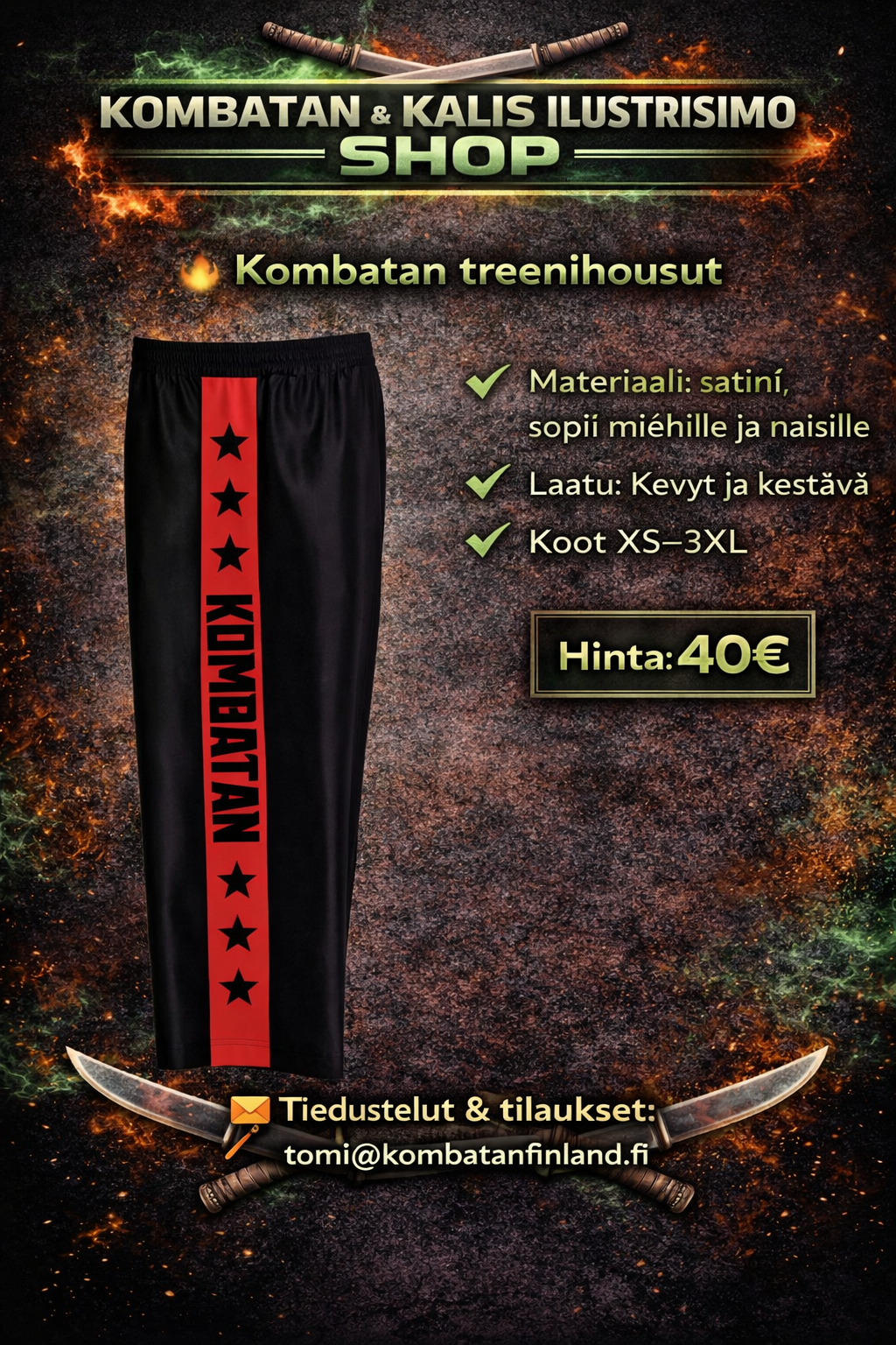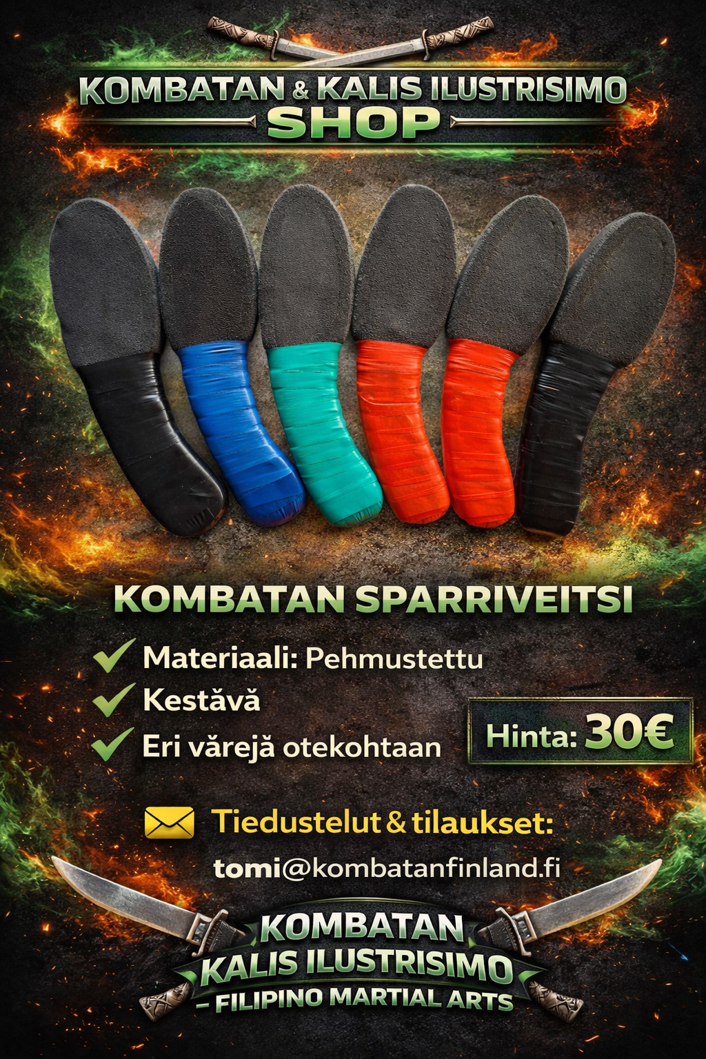 Täältä löydät Suomen Kombatanin ja Kalis Ilustrisimon harjoitusasusteet, harjoitusvälineet sekä vapaa-ajan tuotteita. Tilaukset oman seuran kautta tai suoraan osoitteesta tomi@kombatanfinland.fi