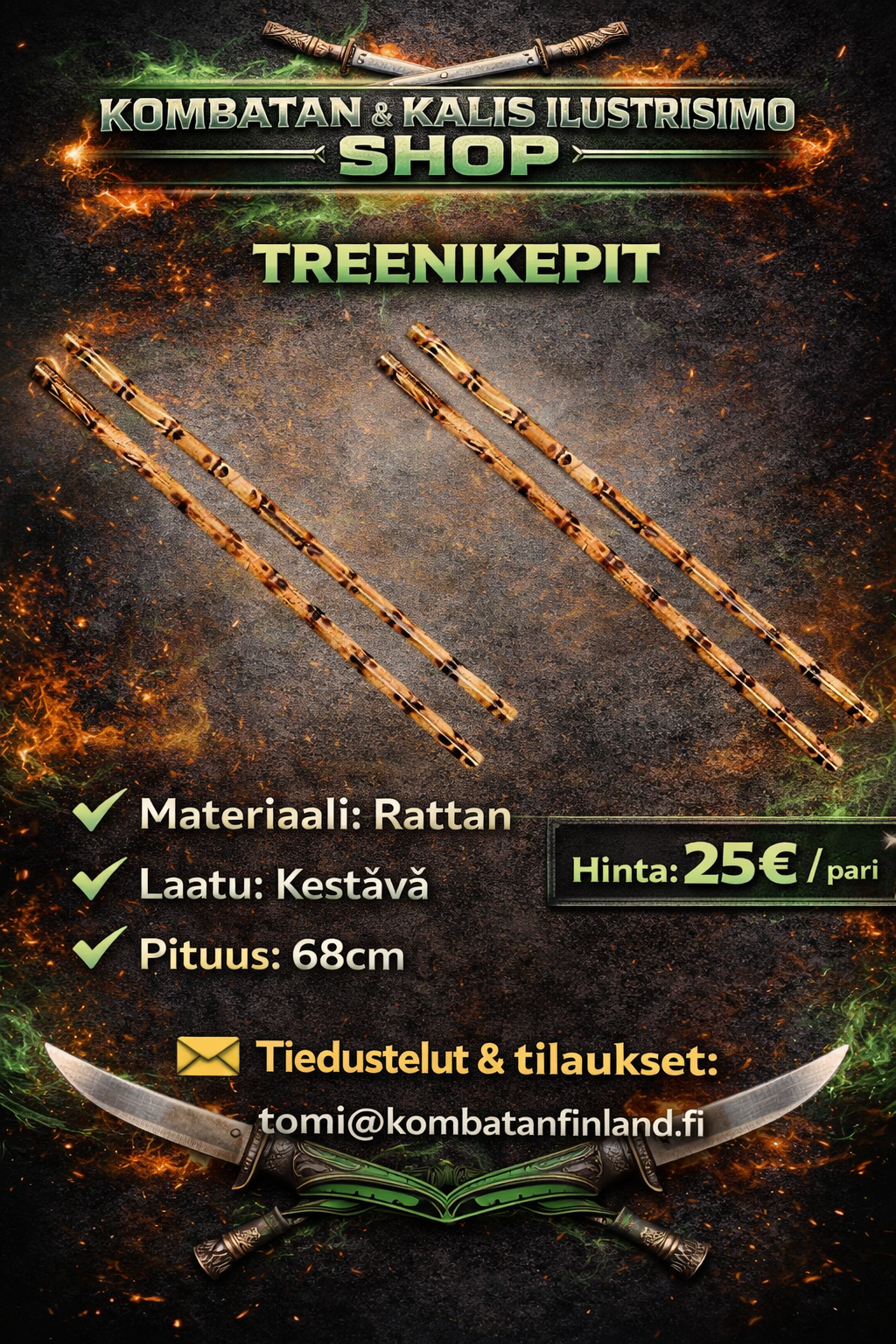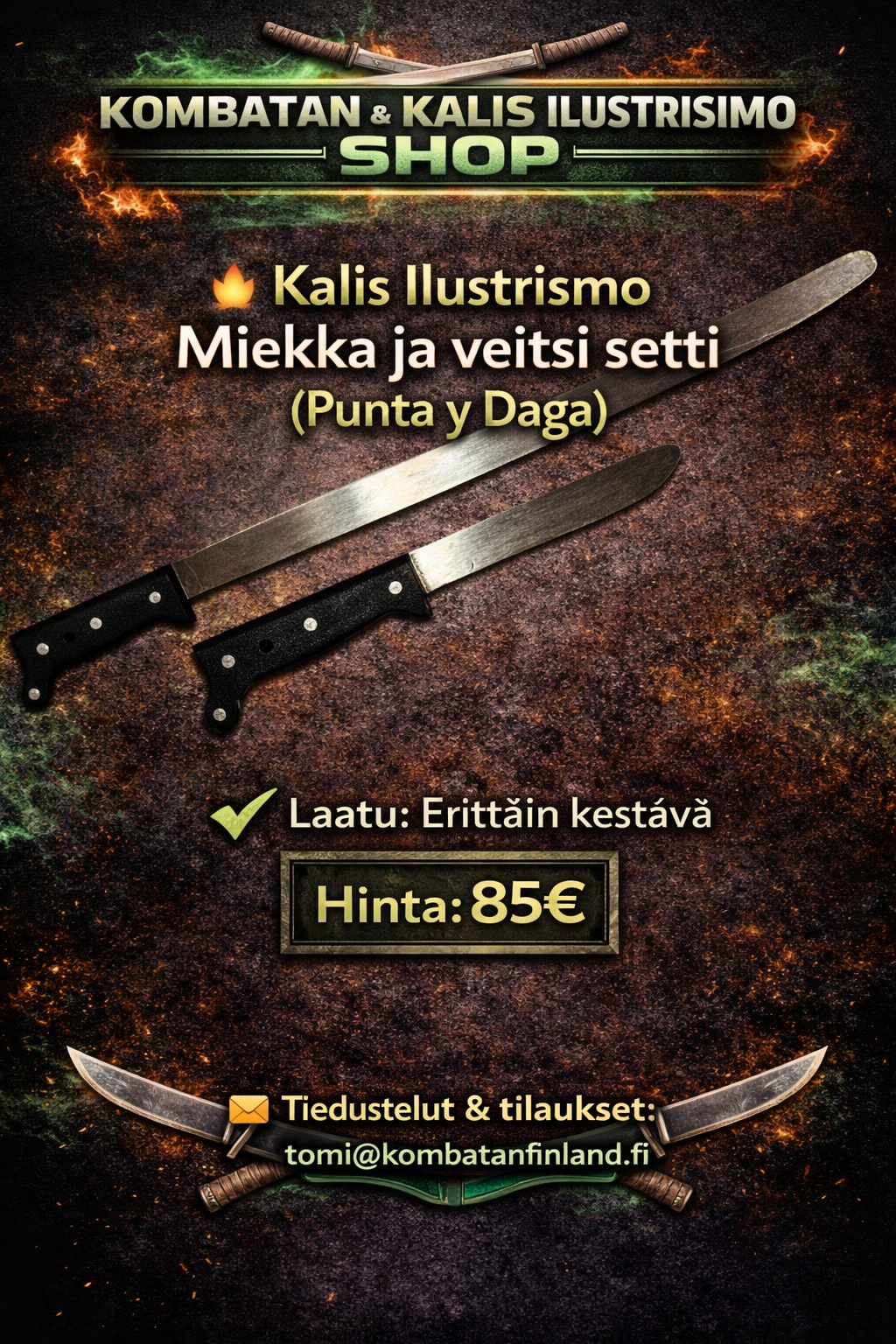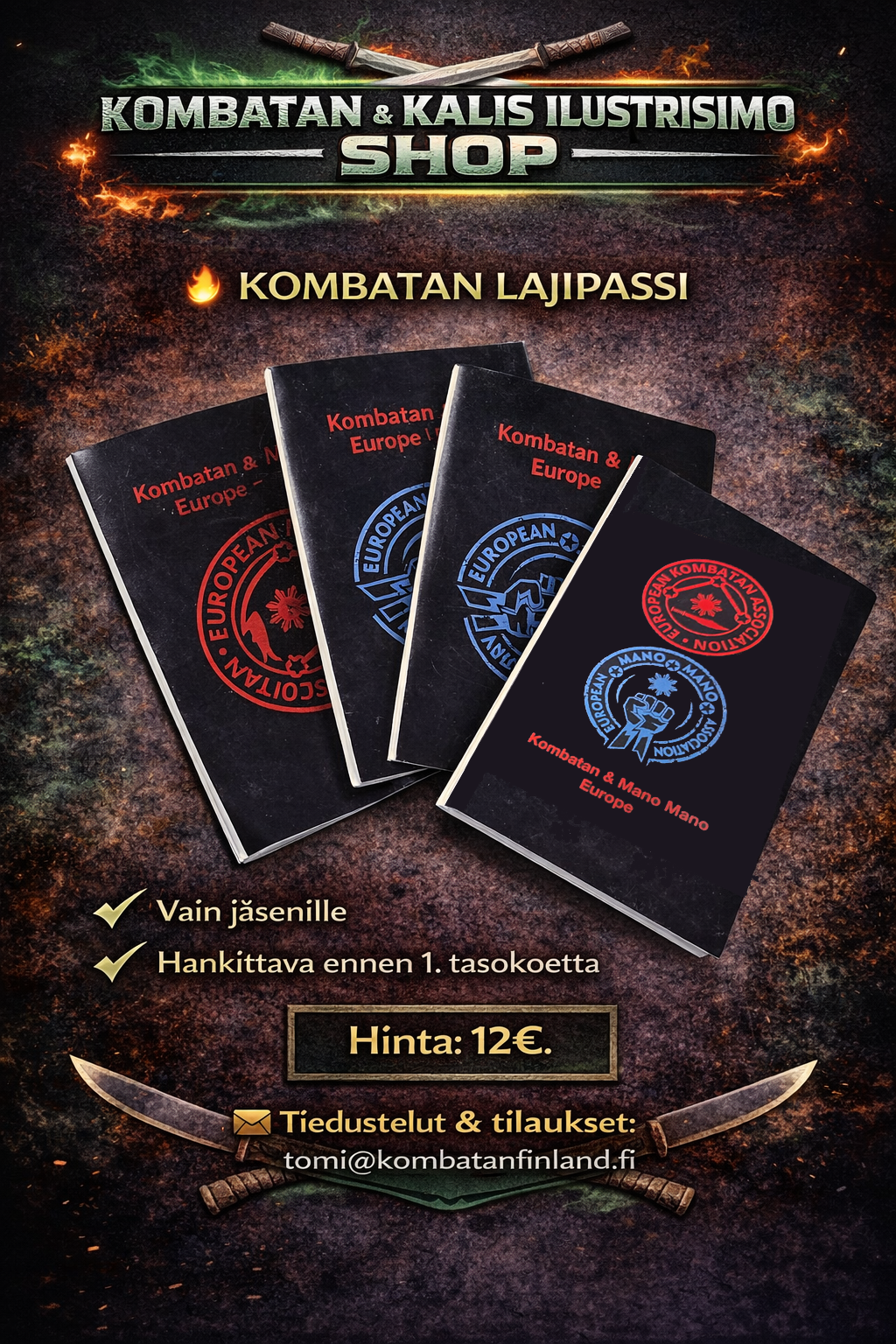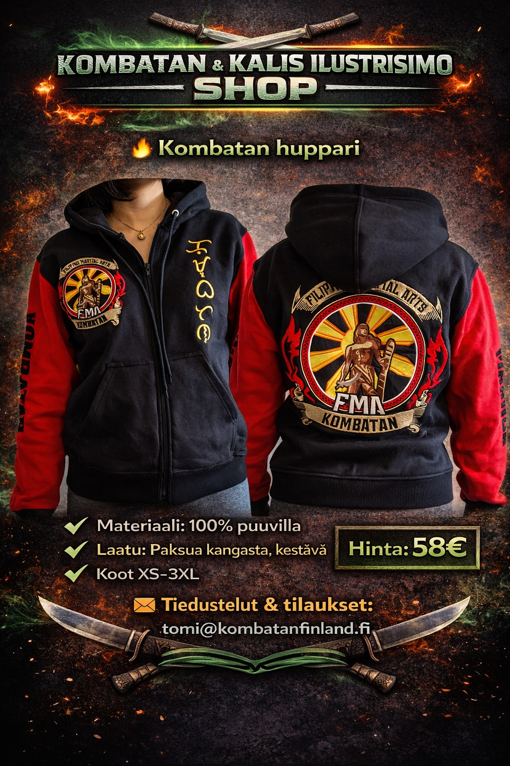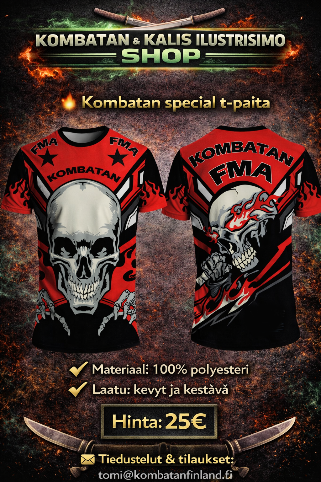 Täältä löydät Suomen Kombatanin ja Kalis Ilustrisimon harjoitusasusteet, harjoitusvälineet sekä vapaa-ajan tuotteita. Tilaukset oman seuran kautta tai suoraan osoitteesta tomi@kombatanfinland.fi
