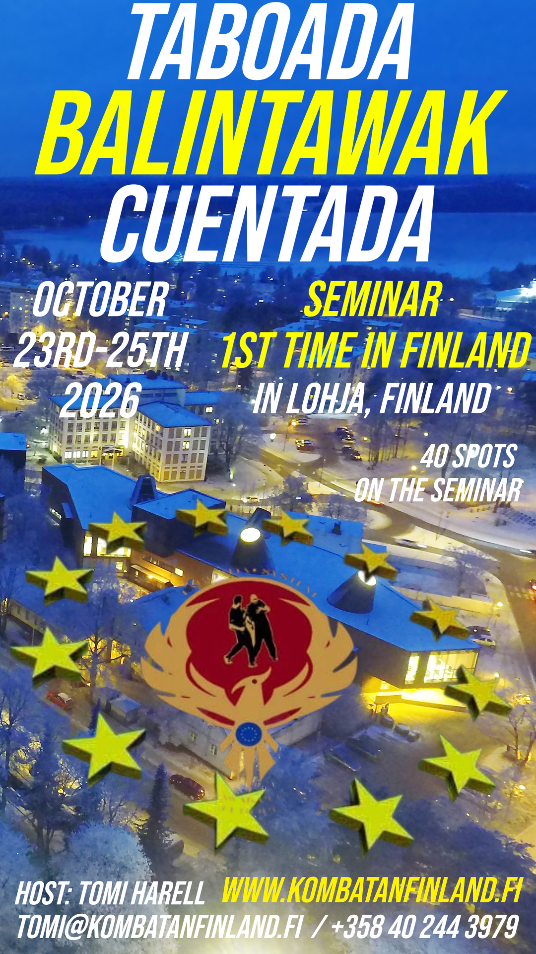 Älä jätä tätä seminaaria väliin, ehdottomasti yksi maailman mielenkiintoisimmasta Filippiiniläisistä kamppailulajeista saapuu Suomeen. Taboada Balintawak Cuentada seminaari ensimmäistä kertaa Suomessa lokakuussa 2026.