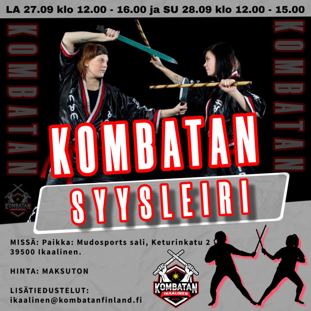 Kombatan Ikaalinen Syysleiri lauantaina 27.09 klo 12.00 – 16.00 ja sunnuntaina 28.09 klo 12.00 – 15.00. Varusteet: T-paita, housut, juomapullo ja pientä evästä sekä omat kepit jos löytyy. Leiripaikalta saa myös lainattua treenikeppejä.