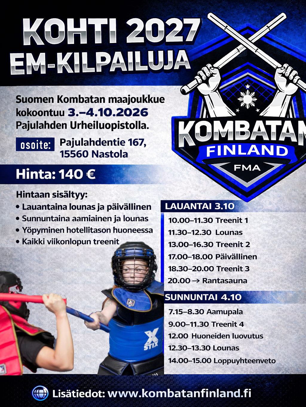 Suomen Kombatan-maajoukkueen viimeistelyleiri kotikisoihin! Tervetuloa mukaan intensiiviselle treeniviikonlopulle Pajulahden huippuolosuhteisiin.